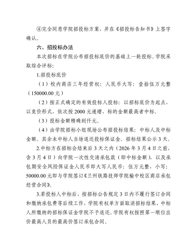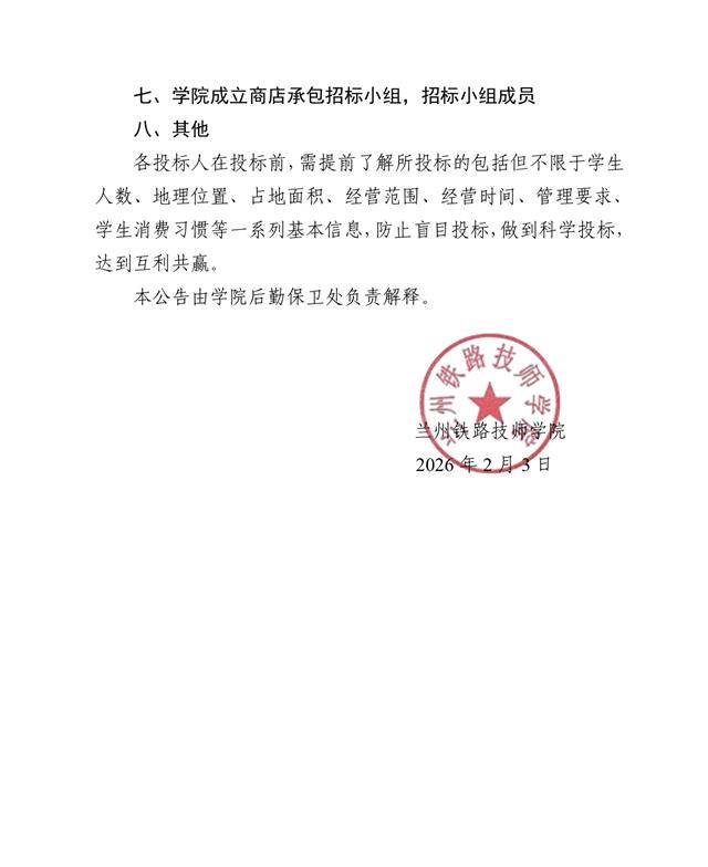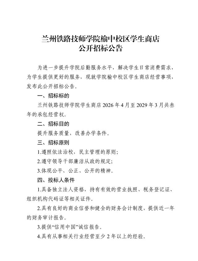 兰州铁路技师学院榆中校区学生商店公开招标公告